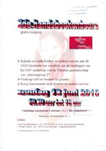 Formaat : 30 x 21 cm. De Vrienden van het Gemeenschapsonderwijs Oostende ; Schenk uw oude boeken en andere curiosa aan de VGO Oostende ten voordele van de leerlingen van het GO! onderwijs van de Vlaamse gemeenschap van scholengroep 27 ; Verkoop zelf uw boeken ter plaatse ; Koop interessante oude boeken en andere curiosa ; zondag 13 juni 2010, 10.30 uur tot 16 uur ; Vrijzinnig LaΓ―cerend Centrum (VLC) "De Geuzetorre", Oostende, Kazernelaan nr. 1