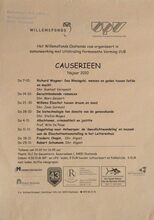 Formaat : 30 x 21 cm. 07/10/2010 : Richard Wagner : Das Rheingold, mensen en goden tussen liefde en macht / Gustaaf Verspeelt ; 14/10/2010 : Geruchtmakende romances / Marc Gevaert ; 21/10/2010 : Willems Elsschot tussen droom en daad / Jean Surmont ; 28/10/2010 : De biotechnologie ten dienste van de geneeskunde / Stefan Magez ; 04/11/2010 : Allochtonen, criminaliteit en justitie / Wim De Paum ; 11/11/2010 : Daguitstap naar Antwerpen : de "dwaallichtwandeling" en bezoek aan de Elsschottentoonstelling in het Letterenhuis ; 18/11/2010 : Frederic Chopin / Algoet ; 25/11/2010 : Robert Schumann / Algoet.