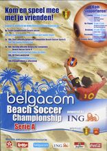 Formaat : 59 x 42 Do. Gratis jeugdinitiatie beach soccer Vr. 10h: yourleague amateurtornooi met Jupiler Night. za. 10h: Start officiΓ«le Belgische competie Beach Soccer Serie A. 16h: ING Family Penalty Cup. Zo. 10h. Vervolg officiΓ«le Belgische competitie Beach Soccer Serie A. 14h: Kids Penalty Cup met Gilles De Bilde 16h: All Stars wedstrijd 17h45 Finalewedstrijd Serie A 18h: Prijsuitreiking & afterdrink.