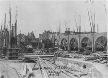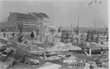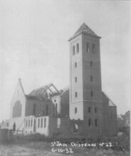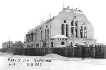 Afdruk. - De kerk in opbouw. Op de achtergrond de Elisabethlaan, het grootste gebouw is hulphuis 6 van de SEO (1925).