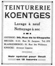Lavage Γ neuf. Nettoyage Γ sec. - Noir spΓ©cial pour deuil en 12 heures. - Ook vestigingen te : 11-13, Rue St. Jacques, Bruges. 51, Rue des PΓͺcheurs, Blankenberge. Avenue Lippens, Knocke.