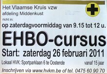 Formaat : 30 x '2 cm. Het Vlaamse Kruis vzw afdeling Middenkust richt in : op zaterdagvoormiddag van 9.15 tot 12 u. EHBO-cursus. Start : zaterdag 26 februari 2011. Lokaal HVK : Sportparklaan 6 te Oostende.