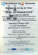 Formaat : 42 x 30 cm. De Antenne en Bimesa Oostende nodigen u uit op de 15de "Wijn- en Kaasavond" ten voordele van BIMESA (Belgian Indonesian Medical Education Social Association). Met deskundige uitleg over de wijnen en kazen door Bernard Vandendriesche en Christophe Haspeslagh op zaterdag 23 oktober 2010 in zaal "De Griffioen", Stenedorpstraat 87, te Stene-dorp. P.a. Leen Stemgee