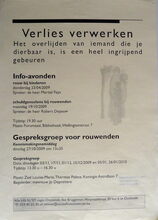 Formaat : 42 x 30 cm. Info-avonden. Rouw bij kinderen. Spreker : Martial Feys. 23/04/2009. - Schuldgevoelens bij rouwenden. Spreker : Robert Depauw. 191/10/2009. Forumzaal Bibliotheek. - Gespreksgroep voor rouwenden. Begeleider Jo Depreitere. Thermae Palace. Ingericht door SIT regio Oostende, Ilse Bruggeman, Hospitaalstraat 35 bus 6 te Oostende