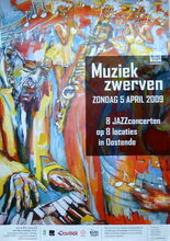 Formaat : 71 x 51 cm. - Ontwerp : Annick Dubisy. 8 jazzconcerten op 8 locaties in Oostende. Muziekzwerven is een realisatie van De Beeldstorm vzw ism Radio Klara, de Cultuurdienst van Stad Oostende, In & Uit ticketbrueau, Vrijstaat O.