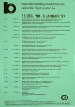 Formaat : 49 x 35 cm. 15/12: Geleid bezoek aan pianobouwer C. Maene. Voordracht met dia's: van druik tot drank, door AndrΓ© Servaes. 16/12: Vogelobservatie in Nieuwpoort en Stuivekenskerke. 17/12: Dia- voordracht: Bulgarije, door dhr. A. Monthaye. Scrabble. Voordracht: naar een nieuw Europa? door prof dr. J. Kruithof. 18/12: Dagreis per bus naar de kerstmartk in Aachen. Advertsbezinning door E. H. Jozef Arnou. 19/12: Ronde- tafelgesprek: beslissingen nemen en schuldgevoelens, door A. Parmentier. Diaprojectie: de Alpensymphonie door W. Vyane. 20/12: Gezellige namiddag. Kerstfeest met voordracht 'Kertsmis vieren een kunst' door E. H. Vandaele. Voordracht met documentatiemateriaal, omtrent Guide Gezelle. door dhr. F. Blomme. 21/12: Dia- avond Tunezio- Marokko - Algerio - Saharo. 22/12: Geleide strandwandeling. 23/12: Rondleiding tentoonstelling ChΓ©ri Samba. 27/12: Kerstconcert doo rde vocale en instrumentale ensembles. 29/12: Geleide strandwandeling. 5/01: Scrabble.