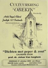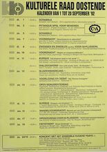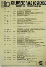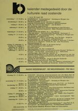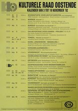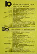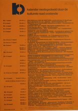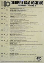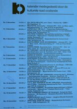 1 maart: Een oogslag over de Westhoek, voordracht door G. Decalf, pastoot te Ekelsbeke (Fr. Vl.) - dialoog - Aartshertoginnestr. 16 a. 2 maart: Vrouwen en Alkoholisme, bespreking en debat - vrouwenhuis vzw - E. Beernaertstr. 40. 3 maart: Koncert met het orkest van radio poznan (Polen) vzw Fonds Georges Maes - feest- en kultuurpaleis. 4 maart: Volksdansinitiatie ATB De Noordstar inl. T. Vansteenkiste Zandheuvel 1, bus A2, Bredene. 5 maart: Viering 25 jaar maandblad vrede, Avondmaal en optreden Chileense zanggroep Lelpehienche, Vrede, Jeugdherberg De Ploate, Langestr. 84. Kursus Sociale Filosofie, Dr. Burghgraeve en anderen - volkshogeschool - kommissiezaal stadhuis. 6 en 7 maart: Reis naar Schouwen-Duiveland - vogelwerkgroep Oostende. Algemene vergadering en feestweekend ATB bergebestijgers - Essen - Inl. Vyaene, Vanhembdenstr. 30. 8 maart: Debat rond het berjaardenbeleid in Oostende - bejaardenklub De Zoete Inval - OHK Schippersstr. 35. Chips, voordracht door H. Naessens - CMBV - 't Centrum Wapenplein. Enkele myten van de vlaamse bewegig, voordracht door dr. W. Debrock - volkshogeschool - konferentiezaal stadhuis. 10 maart: Reis naar Mexico, diavoordracht door R. Desnerck - SVV Oostende De Noordstar. 11 maart: Extra Algemene vergadering kuluturele raad Oostende - stadsvernieuwing in Oostende - konferentiezaal stadhuis. Kultuurhistorie van de gastronomie, voordracht door w. Born - CMBV - Kb, Kapellestr. 16. Ierland en Schotland, filmavond gepresenteerd door de familie Gunst-Vandenbroucke - ATB De Noordstar. 12 maart: Impressies van Noord-Noorwegen, dia-avond soor J. Milh, D. Verstappen en L. Boudolf vogelwerkgroep Oostende - jeugdherberg De Ploate. Mariakerke en het gemeentebeleid, hearing - kultuuropbouw oostende-West - CafΓ© Boxegem, Nieuwpoortstwg. 282. 12 en 13 maart: Het witte schaap van de familie, toneel van L. Du Garde, Peach en Ian Hay door leerlingen Kon. Atheneum I - werkgroep 100 jaar Kon. feest- en kultuurpaleis. 13 maart: Portugese Dans, specialisatiedag ATB De Noordstar. Wat te doen tegen racisme, studiedag - kultuuropbouw W.-VL.- De Tube, Van Iseghemlaan 40. Biljardtornooi wijlen Willen Vansteenkiste - BC Rood-groen - CafΓ© sportsclub, Nieuwpoortstwg. 467. 14 maart: Waterwildtelling vogelerkgroep Oostende inl. L. Boudolf. Oefentocht ATB bergbestijgers vertr. Natuurvriendenmonument in. W. Vyaene, Vanhembdenstr. 30. 15 maart: Uiteenzetting over gezond, zoutloos en toch lekker koken - bejaardenklub De Zoete Inval - OHK Schippersstr. 35. 16 maart: Rolpatronen in de oostendse scholen, bespreking met voorbeelden en debat - vrouwenhuis vzw - E. Beernaertstr. 40. 18 maart: Volksdansinitiatie ATB De Noordstar inl. T. Vansteenkiste, Zandheuvel 1, bus A2, Bredene. 19 maart: Noorwegen, diavoordracht gepresenteerd door W. Vyaene ATB Lokaal Sluisvliet Opex. Oud oostende, dia-avond - Willemsfonds - De Brieke, P. Benoistr. 5. 20 maart: Mexico, het land van de indio, diavoordracht door G. Van Dorpe VTB-VAB Standaard boekhandel, Kapellestr. 103