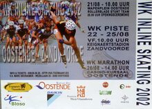 Formaat : 60 x 42 cm. 21/08 - 10.00 uur. WAPENPLEIN OOSTENDE. ROLLERBLADE STUNT TEAM. 20.00 UUR OPENINGSCEREMONIE. WK PISTE 22 - 25/08 VF. 10.00 UUR. KEIGNAERTSTADION ZANDVOORDE. WK MARATHON 26/08 - 14.00 UUR. CASINO - KURSAAL OOSTENDE.