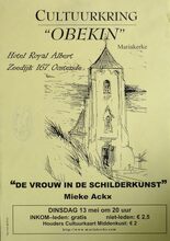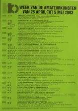 Formaat : 42 x 30 cm. 26/04: Officiele opening: "Week van de Amateurkunsten" door dhr. Johan Verstreken. 25/04-27/04, 1/05-4/05: Tuindagen en tentoonstelling patchwork Rosa Cassaert. 26/04: 4Β° kunstconcert. 26/04-27/04, 3/05-4/05: Kunsttentoonstelling schilderijen, keramiek, metaal, ... 26/04-4/05: tentoonstelling: "De Duinvogels". 26/04-27/04, 1/05-4/05: Kanttentoonstelling en demonstratie. Fototentoonstelling fotoclubs "Spoor" en "De Meeuwen". Tentoonstelling individuele kunstenaars en groepen. 27/04: Aperiteifcocnert door Jef Six en Big Band, met brunch. 27/04, 4/05: Beiaardconcerten door leerlingen van de beiaardscholen van Roeselare en Mechelen. 30/04: Filmprojectie: "Opendeurdag - glaprojectie". 1/05: Aperitiefconcert Camerata Ostendia. 2/05-4/05: Tentoonstelling Kantklossen, 't Ateliertje, en Schilderclubs Colora en 't Penseeltje. Country koppel- en lijndansen. 3/05: Balletvoorstelling: "Ballet voor alle seizoenen". 3/05-4/05: Fototentoonstelling fotogroep 't Katseel. Workshop en open repetities m.b.t. het musical-genre.