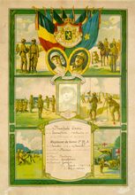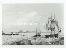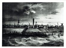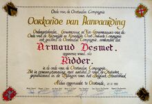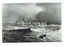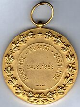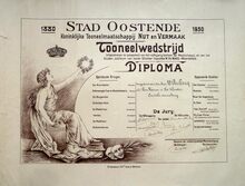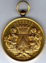 Op de voorzijde : rondom boven OSTENDE, centraal gekroonde wapenschild met keper en drie sleutels van de stad Oostende, geflankeerd door twee stadshouders, links meerman met zwaard naar links kijkend, rechts meermin met handspiegel naar rechts, alles geplaatst op palmbladeren samengebonden met lint, onderaan gesigneerd A. DISPERSYN