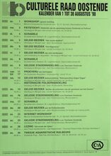 Formaat : 42 x 30 cm. 1/08: Workshop: Games meeting. 3/08: Fietstocht: Historiek van de spoorweg tussen oostende en Torhout. 4/08: Scrabble. 5/08: Geleid bezoek: "Het Joods kerkhof". 6/08: Geleid bezoek: "Fort Napoleon". 7/08: Geleid bezoek aan een wijnbrouwer. 8/08: Scrabble. 9/08: Geleide strandwandeling i.s.m. Toerisme Oostende. 11/08-17/08: Proeverij van bierhapjes. 12/08: Geleid bezoek tentoonstelling: "Retrospectieve Edgar Tytgat". Historische polderwandeling. 13/08: Geleid bezoek "Achter de schermen van de speelzaal van het Casino". 16/08: Geleide Strandwandeling: i.s.m. Toerisme Oostende. 17/08: Scrabble. 20/08: Geleid bezoek aan de politiediensten. 22/08: Internet-workshop. 23/08: Geleide strandwandeling i.s.m. Toerisme Oostende. 28/08: Lezing: "Het eindeder tijden" door Frans Vandermeiren. 30/08: Tweede Aquaristische ruilbeurs.