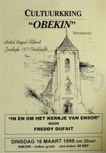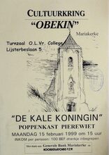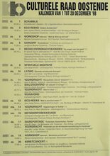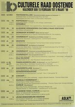 Formaat : 42 x 30 cm. tot 29/05: Tentoonstelling: "Carnaval en de andere stoeten te Oostende". 15/02: Poppenkast Pierewiet. Scrabble. 18/02: Algemene vergadering culturele raad Oostende. 20/02: Workshop internet: SkiΓ«n met een muis? 22/02: Voordracht: "Zoeklicht op het Midden-Oosten" door prof. dr. Rudi Doom. 23/02: Meditatie. 25/02: Voordracht: "De Telefoon te Oostende" door dhr. Walter Major. 26/02: Voordracht: "Chronisch vermoeidheidssyndroom" door Ria Blondeel. Voordracht: "Over de paardenrennen" door dhr. Omer Vilain. 23ste Dia-show. 26/02-27/02: Toneelvoorstelling: "De Bemoeial" van Jack Popplewell. 27/02: Diavoorstelling: "Schotland". Kennismakingsavond. 28/02: Concert. 1/03: Muzikale voordracht Edward Elgar en Ralph Vaughan Williams. Cursus: "Wereldwijnen" door Johan Douchy. 3/03: Algemene vogel-cursus voor beginners. 5/03: Jeugd-boekenbeurs-weekend.