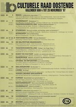 Formaat : 42 x 30 cm. 4/11: Reeks: "Is Marxisme nog actueel?" door Louis Van Geyt. 7/11: Voordracht: "Cholesterol" door Micheline Houthooft. Theatervoorstelling: "Omtrent Edmunt RΓΆssler" Van Wannes Van De Velde. 8/11: Studiedag: "Sta op je rechten, als leerling, als ouder en leerkracht". Workshop: ICQ en Netmeeting. 8/11-9/11: Tentoonstelling: "150 Jaar Maalboten". 10/11: De Malpertuis Maandagen. 11/11: Theatervoorstelling: "Vrijdag" Van Hugo Claus. 13/11: Kunste en cultuur: "Justitie: de onbekende bekend?" o.l.v. Meester Vandelacluze. Diamontage: "Madeira, de parel in de Atlantische Oceaan". OPvang- en infoavond over echtscheiding. 14/11: Dialoogavond: "De Koerden" door Ludo De Brabander en Derwish Ferrho. Lezing: "De Graal" door K. Logge. Vergelijkende discografie. 17/11: Cursus: "Assertiviteit voor grootouders" door Ann Delye. Diavoordracht: "Dia's over de gevels van Oostende" door dhr. Cornillie. Voordracht: "China in evolutie" door dhr. Frank Willems. 18/11: Reeks: "Is Marxisme nog actueel?" door Rudolf BoΓ«hm. 19/11: Voordracht: "Herwaardering vand e vrouwelijke waarden". 20/11: Bezoek Juwelenontwerpster Els Ongenae.