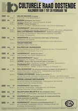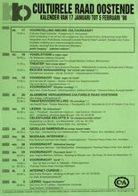 Formaat : 42 x 30 cm. 17/01: Voorstellen nieuwe cultuurkaart. 18/01: Vogelstudie in eigen regio. Theater: "Een vrouw alleen" van Dario Fo door Rosanne Pauwels. Bezoek tentoonstelling: "Het vertrek naar Ijsland". 19/01: Voordracht: "Water: zegen en vloek" door dhr. M. Capoen. Voordracht: "Rituelen Vandaag" door mevr. Carla Rosseel. 20/01: Algemene vergadering culturele raad oostende. Theatervoorstelling: "De CongiΓ«rge" van Harold Pinter. 21/01: Lezing: "De Orthodoxen" door I. Peckstadt. Celestijnse Belofte 8: "De Interpersoonlijke ethiek" door Luc Bonte. 24/01: Gezellig samenzijn en instap neiuwe leden. 26/01: Muzikaal intervieuw: Kris Vanhove intervieuwt Herr Seele. 28/01: Voordracht: "Attitudinal healing" door Monique Swinnen. 29/01: Voordracht: "Duurzaam leven" door Virginie Michiels. 2/02: Voordracht: "SyriΓ«" door dhr. en mevr. A. Haesaert. 3/02: Internet-cursus door Frank Goosens. 5/02: Lezing: "August Vemeylen" door prof. dr. R. Laridon.