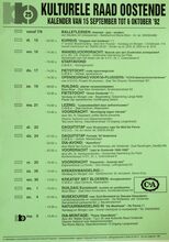 Formaat : 42 x 30 cm. Vanaf 7/9: Balletlessen. 15/09: Cursus: Omgaan met kinderen, Ann Pylyser. 16/09: Wandelvoordracht: Bezoek aan een Oostendse scheepswerf, olv. dhr. JB. Dreesen. Startavond. 17/09: Fietstocht: oude spoorwegroute. Open- deurdag voor 50- plussers. 19/09: Ruildag: allerlei verzamelobjecten. Fietstocht: Groot Oostende. 21/09: Lezing: Levenskwaliteit doo rzelfvertrouwen. Voordracht: beveiliging tegen inbraak. 22/09: Daguitstap voor 50- plussers. 24/09: Daguitstap Floriade '92 Nederland. Dia- avond: Alpenflora. Voordracht: Jazz te Oostende 1945- 1980. 25/09: Voordracht: Esperanto- levende taal. 26/09: Krekenwandeling. 30/05: Kreatief met bloemen: droogboeketten. 1/10: Ruildag Euromunt: munten en postkaarten. 4/10: Busexcursie naar Zuid- Beveland en Zeeuws- Vlaanderen. Natuurwandeling in de Westhoek. 5/10: dia- montage: Frans Vlaanderen, dhr. Walter Duyck.