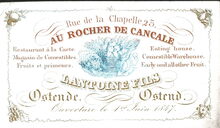Formaat : 5,3 x 9,2 cm. - Rue de la Chapelle - Au Rocher de Cancale - Restaurant ร la Carte, Magasin de Comestibles, Fruits et primeurs. Enting House, Comestible Warehouse, Early and all other fruit. - LANTOINE FILS Oostende - Ostend - Ouverture le 1er Juin 1847