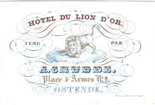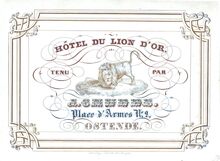 Formaat : 7,6 x 11,6 cm. - Hôtel du Lion D'Or tenu par J. Cnudde Place d'Armes N°2 Ostende. Hotel op de hoek van het Wapenplein en Sint-Sebastiaanstraat