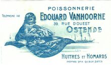 Afdruk. - Formaat : 7,7 x 13,8 cm. - Poissonnerie Edouard Vanhoorne. 39 Rue d'Ouest Ostende. - Téléphone 104. Huîtres et Homards mêmes prix qu'aux parcs.