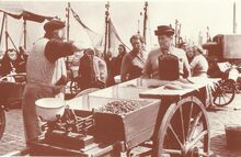 Eduard Demeulemeester, (bijnaam "Smoetgat") (rechts), eigenaar van de O.190 "Louis", lost met collega een "bénne" garnalen.