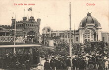 Edit. V.G. [=Victor Grรฉgoire], 42 avenue du midi, Bruxelles. - Ostende - La Sortie des Courses. - De uitgang van de paardenkoers tegenover de Koninklijke Gaanderijen. Het fort Wellington deed dienst als ingang van de Wellingtorenbaan en was gelegen langs de Koersenlaan. Nu Koningin Astridlaan.