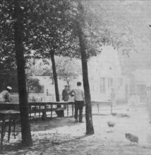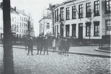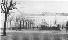 Foto : De Square Baudouin van uit een andere hoek gezien (1897). - Met rechts tussen de twee huizenblokken de Zuidstraat en vooraan een groep kinderen