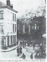 Foto : De Sint Pieterskerk met zicht op het hoofdportaal met het beeld van de patroonheilige Sint Pieter (1896). - De brandende kerk tijdens het blussen