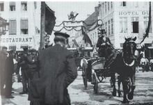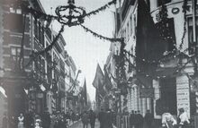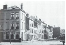 Foto : De Kapellestraat, kruispunt met de Keizerskaai (thans Vindictivelaan) (1901). - Feestelijke versiering ter gelegenheid van de eerste steenlegging van de Sint Petrus- en Pauluskerk op 5 augustus 1901. Met veel volk en koets