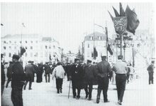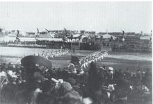 Foto : De Kapellebrug, kijkend naar de Kapellestraat (1901). - Feestelijke versiering ter gelegenheid van de eerste steenlegging van de Sint Petrus- en Pauluskerk op 5 augustus 1901. Met veel volk