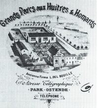 Foto : De Oostendse oesterteelt genoot wereldfaam (1910). - Litho van de Grands Parcs aux Huitres et Homards, ancienne firme L. Del Bouille, gelegen aan de oosteroever van de haven