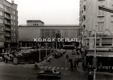 Formaat : 6,5 x 8,5 cm. - De zuidgevel en hoofdingang van de Kursaal, gezien vanaf de Leopoldlaan