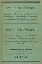 Advertentie : Firma J. Baels-Mauricx, 93, Rue de la Chapelle, Ostende. - Gesticht in 1878, Reederij, beschrijven en besturen van stoomtreilers, motorbooten en allerhande verhandelingen betreffende zeevisscherij