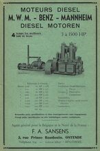 Advertentie : Diesel motoren MWM Benz Mannheim, agent gΓ©nΓ©ral pour la Belgique et le Nord de la France : F.A. Sansens, 3, Rue Baudouin, Ostende. - 4 takt de beste, 3 Γ 1500 hp.