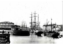 Zicht op de handeldsdokken gezien vanaf de Stockholmstraat, rechts het eerste station en links de Keizerskaai