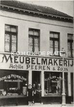 Formaat : 15 x 10 cm. - Gevelopschrift : Meubelmakerij Achille Peeren & Zoon. Opschriften op winkelruiten : links : Achille Peeren & Zoon. Meubelmakerij ; rechts : Alle Slach van Meubels in Magazijn.