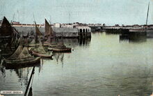 Postkaart VO-DW. - Ostende - Bassin. - Bijgekleurde kaart. - Oostendse schovers gemeerd in het Schuildok. - In het midden van het dok, de toegang tot de havengeul. Links, op de Oosteroever, de tweede vuurtoren.