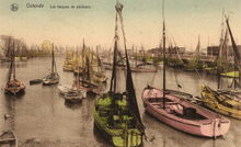 Edit. V.G.[= Victor Grégoire], 42, Avenue du Midi, Bruxelles. - Ostende - Le port. - Oostendse schovers gemeerd in de voorhaven. Wat verder links, pakketboten van de Oostende - Doverlijn gemeerd nabij het Zeestation. Rechts, de Oosteroever, met de oude Vuurtorenwijk en de tweede vuurtoren.
