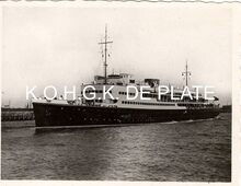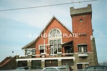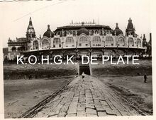 Formaat : 6 x 8,5 cm. - De noordgevel van de derde Kursaal langs de Zeedijk, gezien vanaf het Groot Strand op een golfbreker