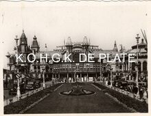 Formaat : 6 x 8,5 cm. - De zuidgevel en hoofdingang van de derde Kursaal, gezien vanaf de Leopoldlaan. De auto heeft reeds de stad verovert. Let op de sierlijke straatlantaarns en de immer verzorgde bloemenperken door de groendienst van de stad. Oostende in het interbellum