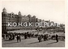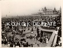 Formaat : 6 x 8,5 cm. - Veel volk op de Zeedijk tijdens een zomerse dag. We zien de westelijke gevel van de derde Kursaal. Dit plekje wordt "Petit Nice" genoemd. Men kan er van de zon genieten tijdens dagen dat een kille noord-oostenwind waait.