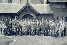Zittend v.l.n.r.: Vermeersch, Ladon, Buys, De Backer, De Buf, Devisscher, Directeur ir. L.J. Tanghe, Lemmens, Vandeberghe, Frankignoul, Mullier, Bastin, Hofman.