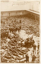 Prisonniers Anglais juin 1917 Ostende. - Naar aanleiding van operatie "Strandfest" werden ongeveer 1250 Britten krijgsgevangenen genomen. Hier een groot aantal van hen op de koer van de Albertschool, toen Kommandantur.