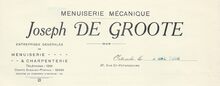 Mechanische schrijnwerkerij gesticht in 1887 door Joseph De Groote en overgenomen door zijn zoon Joseph jr. in 1937. Deze wordt sedert 1960 bijgestaan door zijn zoon Willy. De firma neemt alle schrijnwerk aan. Specialiteit : het inrichten van keukens en winkels. De firma telt een twintigtal werknemers. In : Dit is West-Vlaanderen : steden, gemeenten, bevolking : dl.2 / Lucien Dendooven. Flandria, 1963. p. 1277