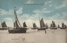 Le Bon, éditeur, Ostende, . - Ostende. Départ pour la pêche. - In het midden, open garnaalboten of Oostendse schovers. Links, de Visserskaai. Aangemeerd, een panneschuit, de P.14 "Marie Thérèse".