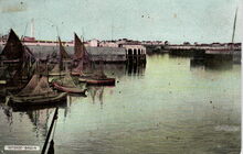 Enkele vissersvaartuigen in het Schuildok en wagons van een vistrein langs de Visserskaai nabij het Vissersplein