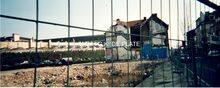 Formaat : 10 x 25 cm. CafΓ© Den Haring op de hoek van de Graaf de Smet de Naeyerlaan en de Lijndraaiersstraat is afgebroken