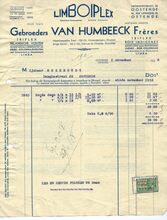 Oud huis Gebroeders Van Humbeeck. Maatschappelijke zetel : Vilvoordelaan 100-120, Brussel. - Triplex - Inlandse houtsoorten - Invoer van all herkomsten van eiken - kolonialehouten voor schrijnwerkerij en ebbenhoutwerk. Limba