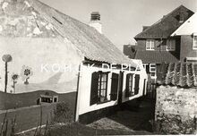 Formaat : 12 x 8 cm. - Ten westen van de Onze Lieve Vrouw Ter Duinenkerk is de omwalling van de verdwenen pastorie nog zichtbaar. Aan de zuidoostelijke hoek van het kerkhof, aan de Dorpsstraat 80, bevindt zich nog het laatst bewaarde witgeschilderd vissershuisje, gebouwd in 1822 voor de familie Corveleyn.