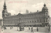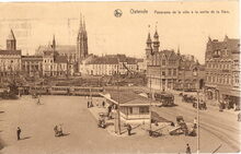 Nels, Ern. Thill, Bruxelles. - Ostende. Panorama de la ville Γ la sortie de la Gare. AlgemeenΒ zicht op de Vandersweepplaats met centraal het tramwachthuisje. In de achtergrond een zicht op de stad