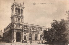 Le Bon, Γ©diteur, Ostende. 128 OSTENDE. - La Nouvelle Poste. - Het postgebouw in de Hendrik Serruyslaan gezien vanuit het Leopoldpark. Links, de huidige Wittenonnenstraat, rechts de Ooststraat (huidige Poststraat)