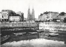 Formaat : 18 x 24 cm. - Centraal in de achtergrond de Sint-Petrus- en -Pauluskerk, Links op de hoek 't Waterhuis (gevelopschrift : "General supply of drink water"), daarnaast Hotel Atlantis (gevelopschrift : bières de l'Aigles) aan de Vindictivelaan. Rechts op de hoek Hotel Au Nouveau Passage. Op de voorgrond de Visserskreek met visserssloepen. Op de kaai zien we platte viskarren en een treinwagon.